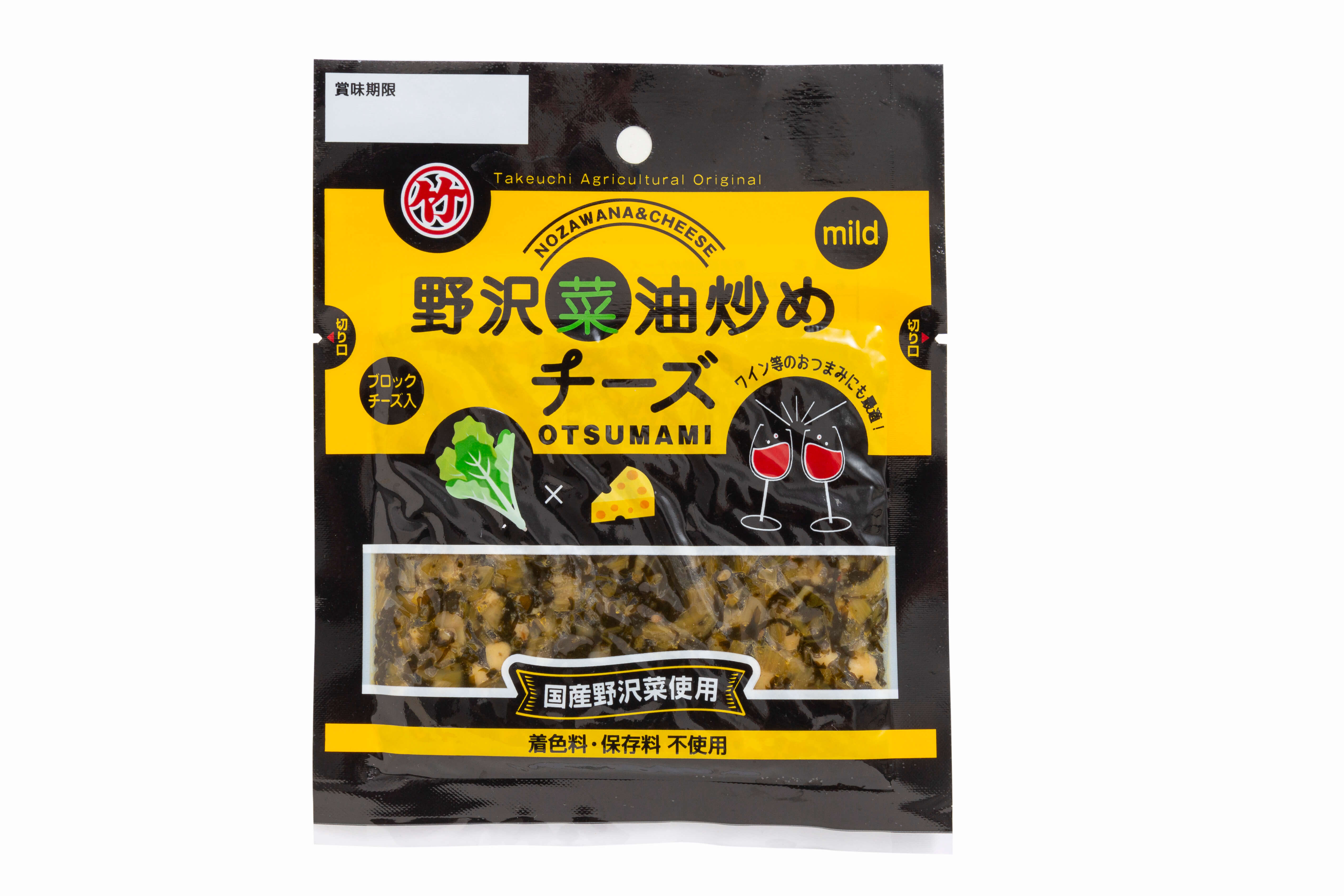 細かく刻んだ野沢菜に醤油、かつおエキス、煮干しエキス、ごま油を加え、仕上 げに唐辛子をぴりっと効かせた信州の昔ながらの野沢菜油炒めに、キューブ状 のFDチーズを加え、贅沢な逸品に仕上げています。