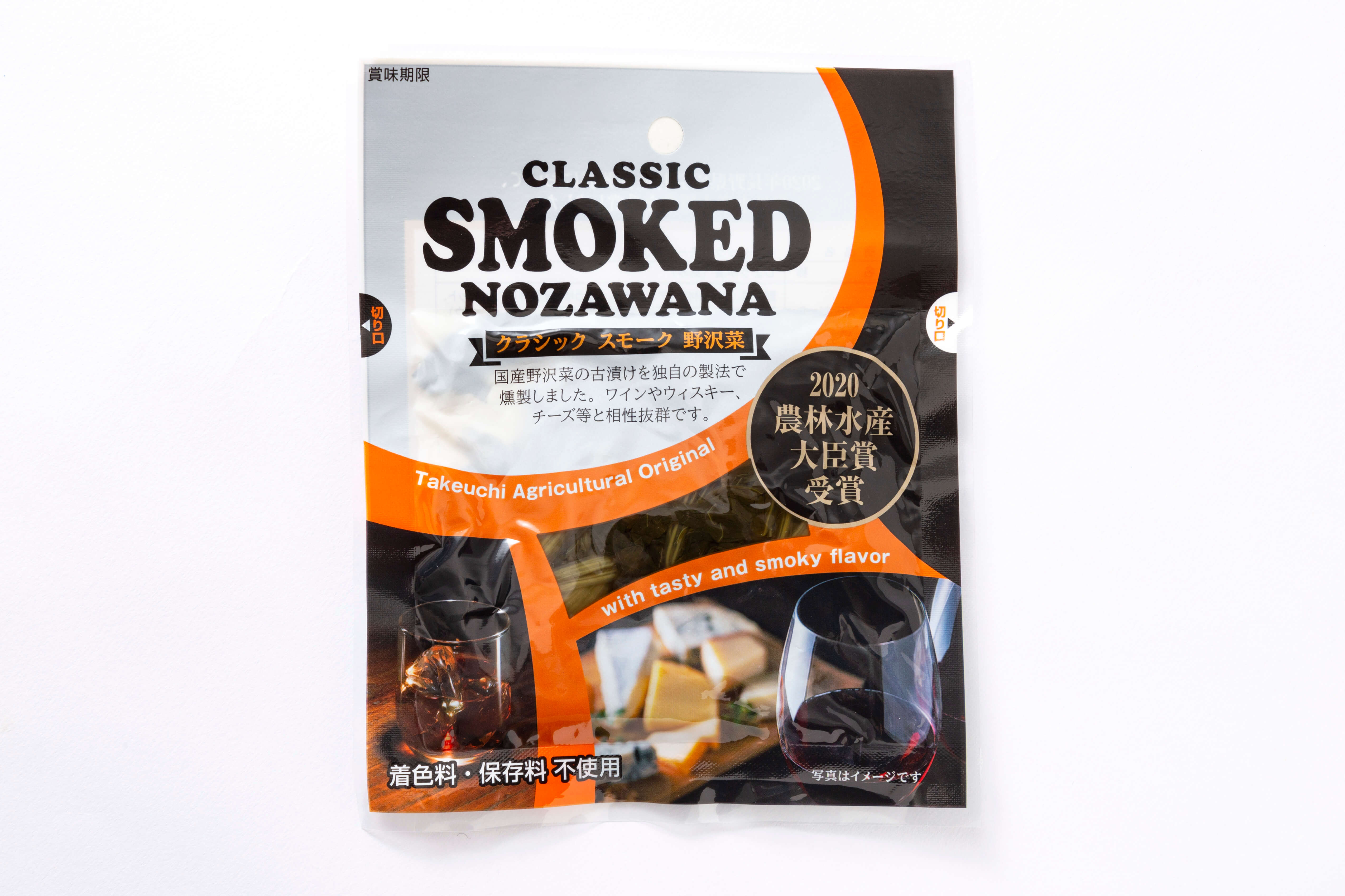 じっくり時間をかけて漬け込んだ香り高い野沢菜の古漬を、お醤油ベースの調 味液で味付けをし、香り付きの良い桜のチップでじっくりといぶして燻製にしました。
