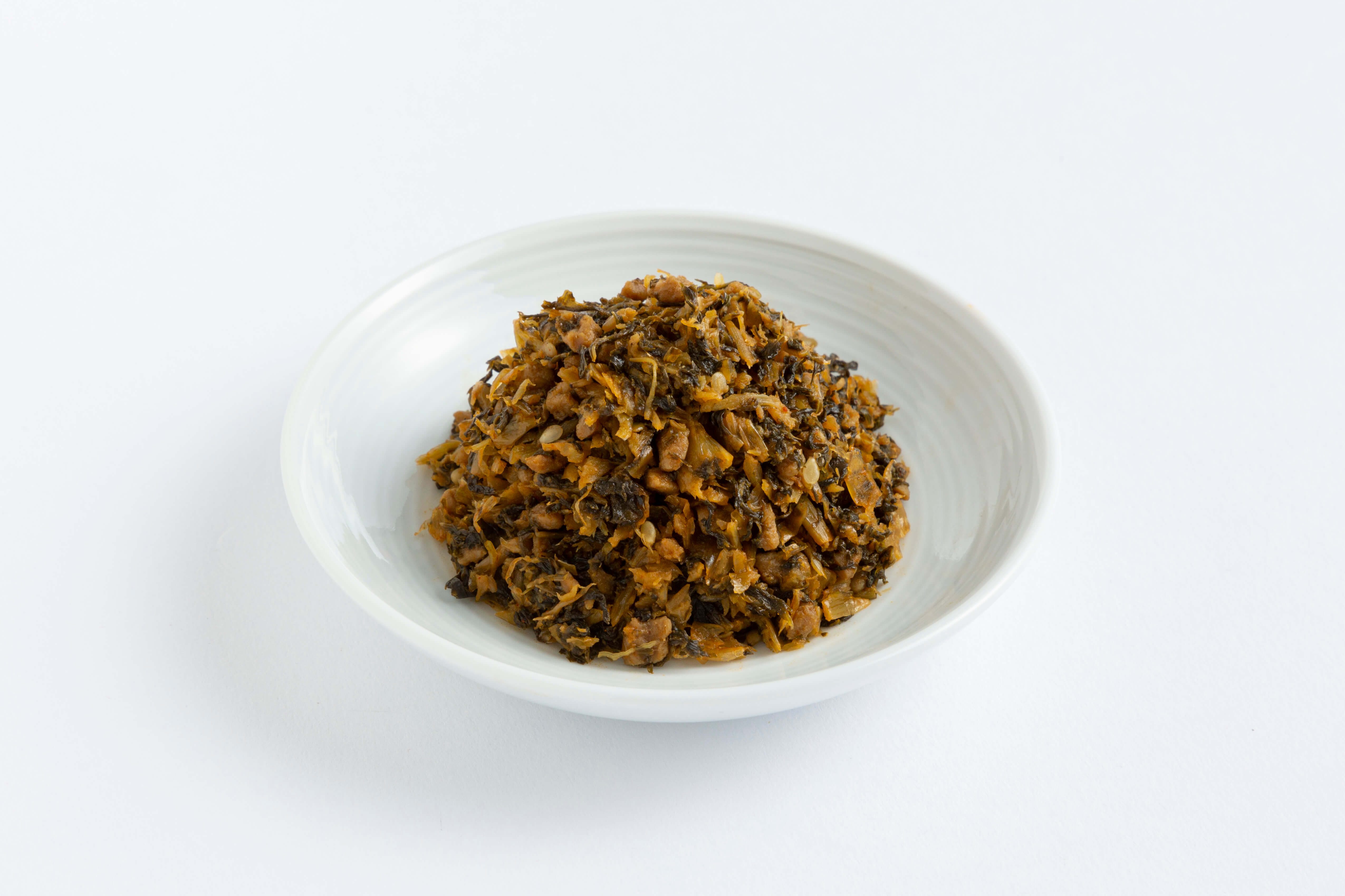 じっくり時間をかけて漬け込んだ香り高い野沢菜の古漬に、ビーフやチキンの旨味とコク深い練りゴマと唐辛子を加え、風味豊かでピリ辛な坦々風に仕上げました。さらに大豆たんぱくがお肉のような食感になり、食べごたえもある逸品です。