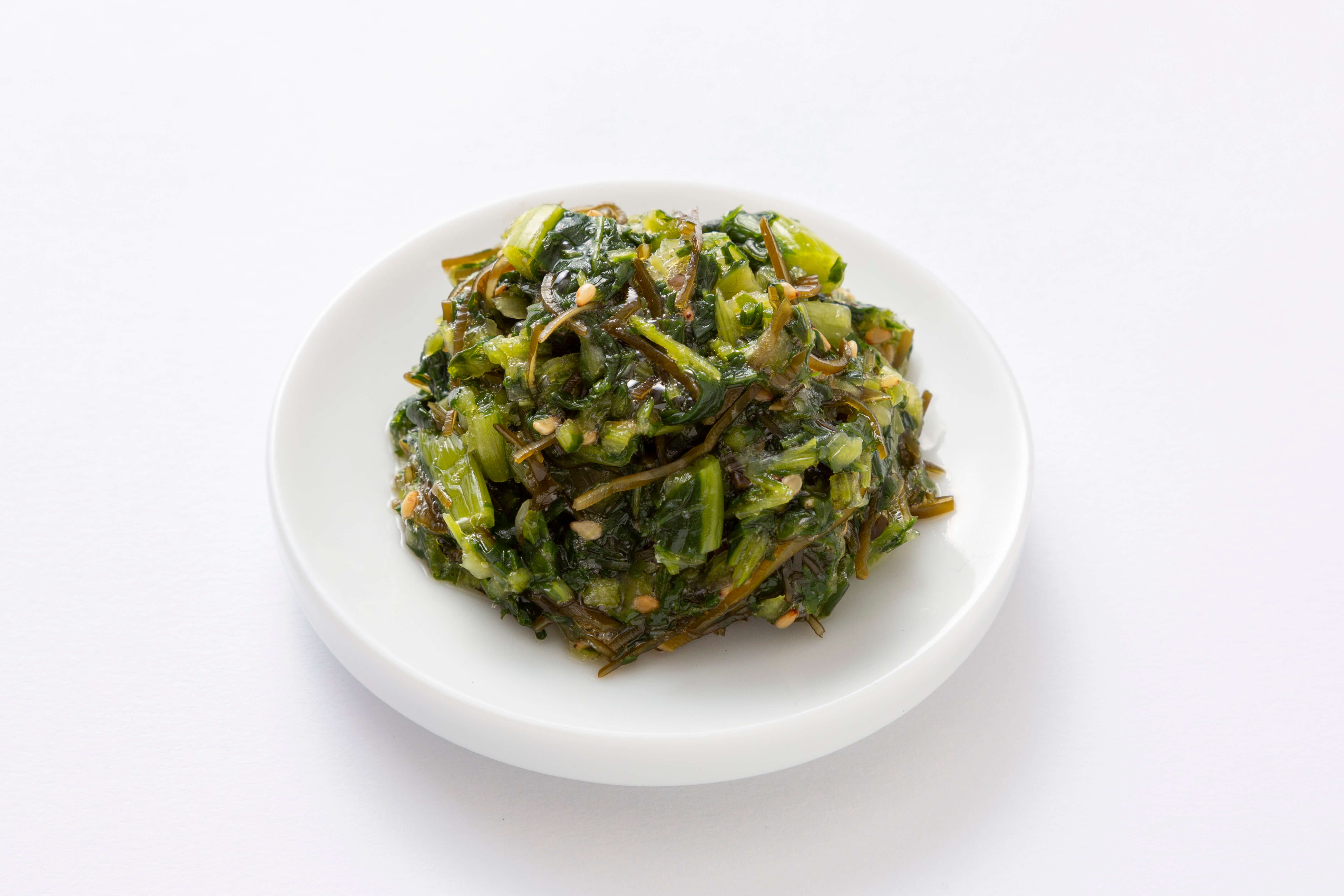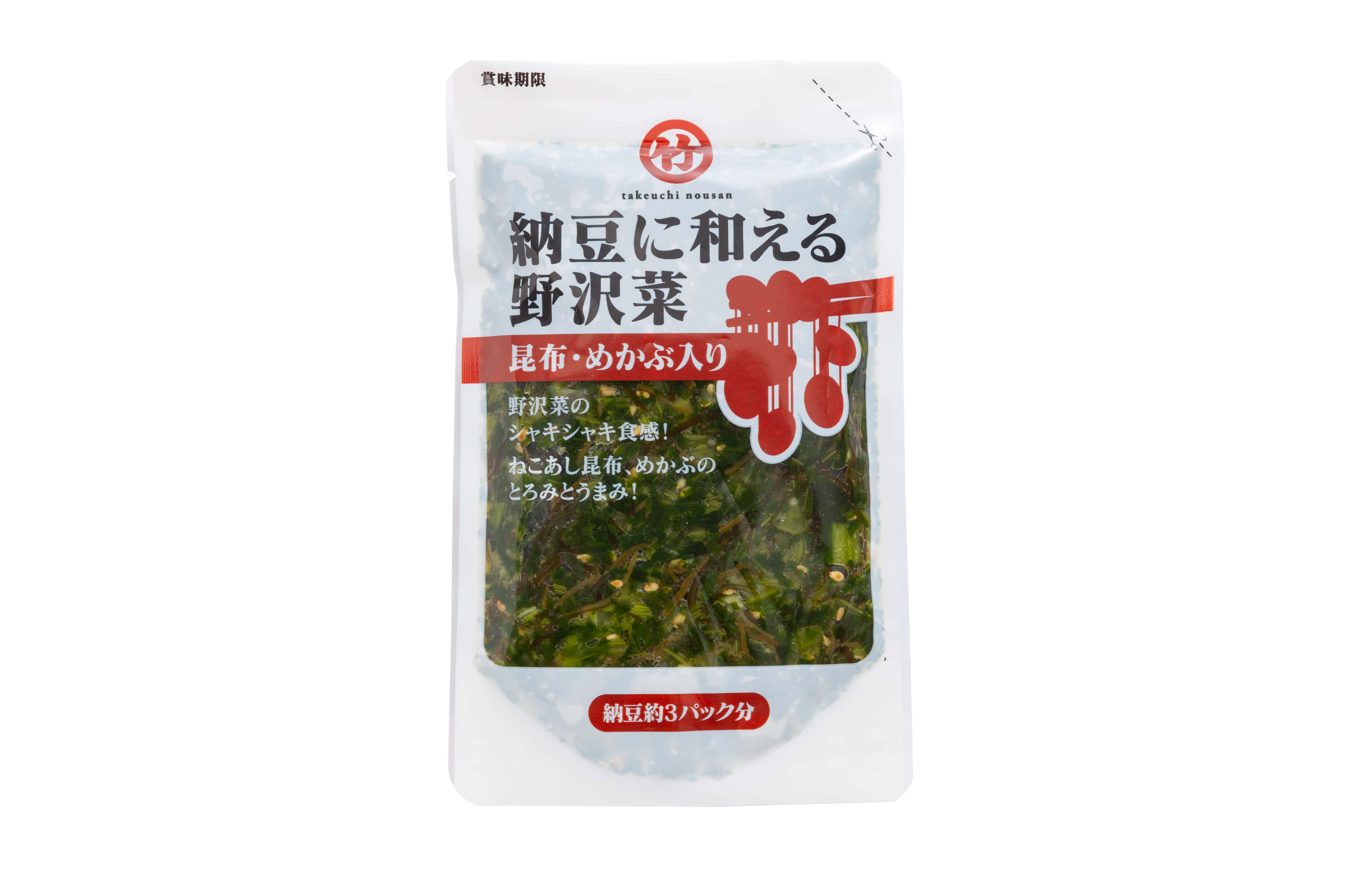 細かく刻んだ国産野沢菜に旨みとネバとろ感が楽しめる昆布とめかぶを加えま した。野沢菜のシャキシャキ感とほのかな酸味で納豆がさっぱりと食べやすくな りご飯が進みます。