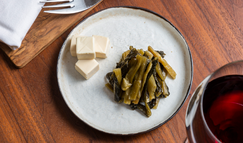 秋田の「いぶり漬け」をヒントに、野沢菜の古漬けに桜チップの煙でいぶし香り付けをすることに成功。